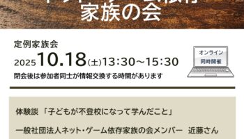 毎月第3土曜日家族会を開催しています。 「家族会」には、ご家族に「ネット・ゲーム依存」のある方ならどなたでも参加できます。オンライン(ZOOM)で参加することもできます。