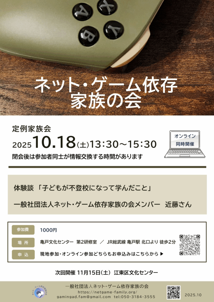 【10月定例会家族会ブログ】「子どもが不登校になって学んだこと」 イベント情報 10月は当会メンバーに「子どもが不登校のなって学んだこと」と題し体験談を講演いただきます。家族のネット・ゲーム依存でお困りの方、子どもとの関わりでお困りの方はせひご参加ください。 会場は亀戸文化センターです。オンラインも併用での開催です。 なお、ご参加は会場・オンライン参加問わず事前のお申込みが必要です。こちらからお申込みのご連絡をお願いします。 ネット・ゲーム依存2025年10月_page-0001ダウンロード