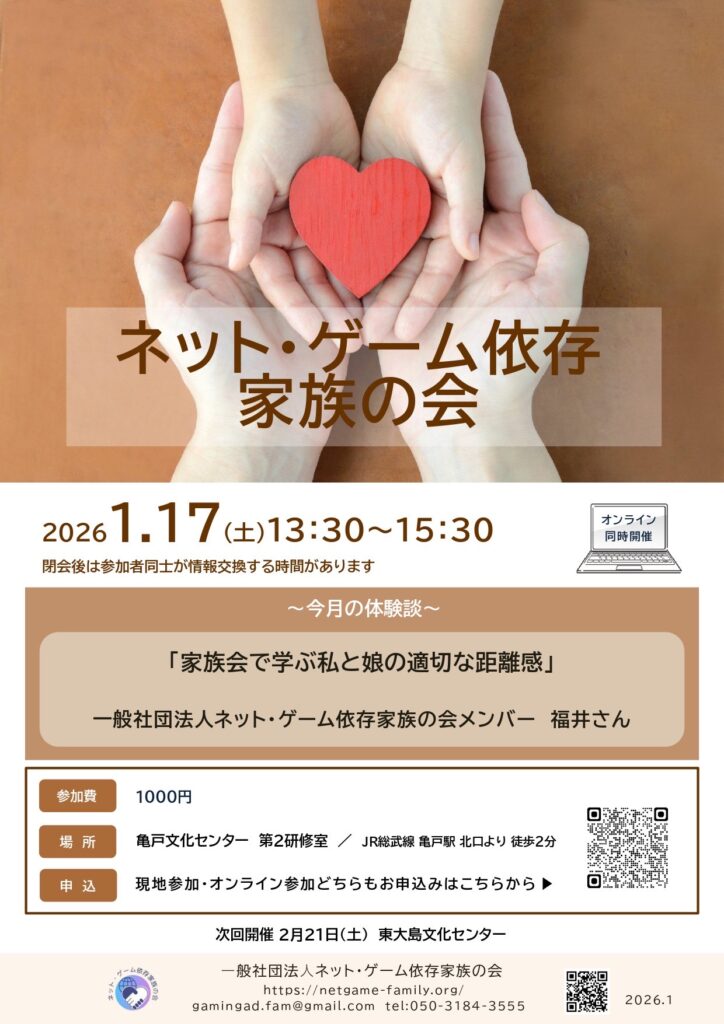 【2026年1月定例家族会】「家族会で学ぶ私と娘の適切な距離感」 イベント情報 1月は、当会メンバーが「家族会で学ぶ私と娘の適切な距離感」と題し、体験談をお話いたします。その他、当会メンバーにインタビューを行います。家族のネット・ゲーム依存でお困りの方、子どもとの関わりでお困りの方等、ぜひご参加ください。 会場は亀戸文化センターです。オンラインも併用での開催です。 なお、ご参加は会場・オンライン参加問わず事前のお申込みが必要です。こちらからお申込みのご連絡をお願いします。 game0117ダウンロード