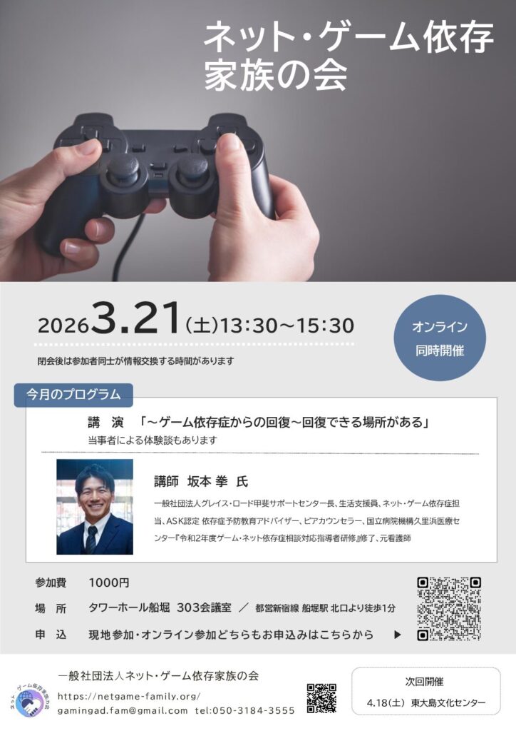 【2026年3月定例家族会】「~ゲーム依存からの回復~回復できる場所がある」 イベント情報 3月は、一般社団法人グレイス・ロード甲斐サポートセンター長 坂本氏より「~ゲーム依存からの回復~回復できる場所がある」と題し、体験談をお話いただきます。その他、当会メンバーにインタビューを行います。家族のネット・ゲーム依存でお困りの方、子どもとの関わりでお困りの方等、ぜひご参加ください。 会場はタワーホール船堀です。オンラインも併用での開催です。 なお、ご参加は会場・オンライン参加問わず事前のお申込みが必要です。こちらからお申込みのご連絡をお願いします。 ネット・ゲーム依存2026年3月ダウンロード